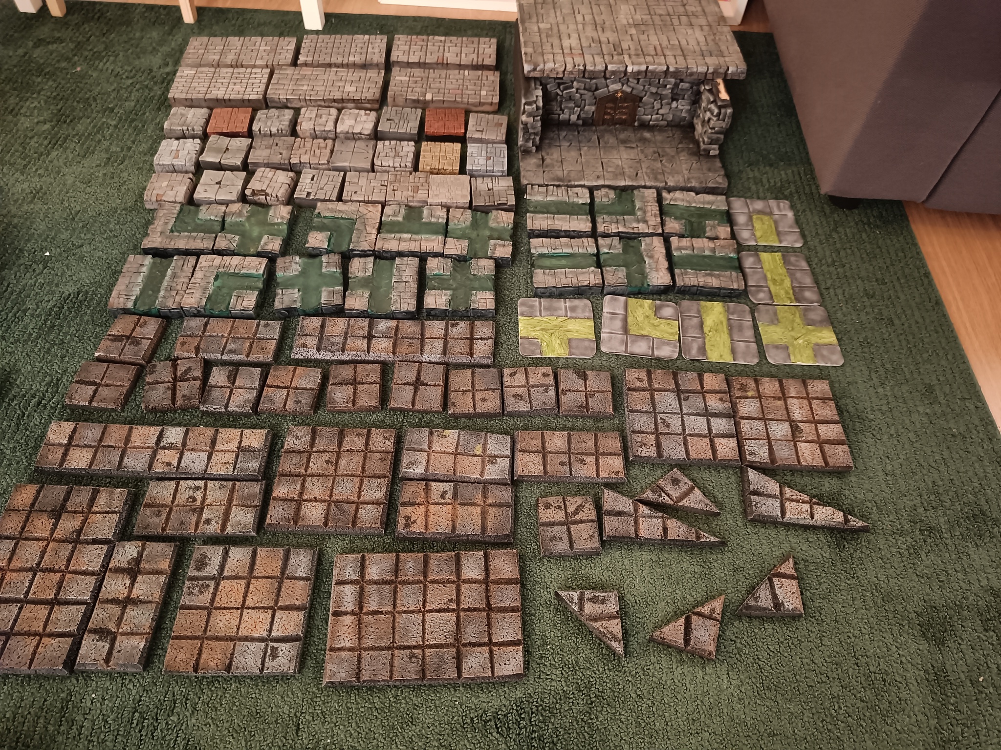 Je donne un ensemble de décors (fait main avec du polystyrène et du liège) représentant des tuiles de donjon. La plupart représentent un classique donjon de pierre grise, mais quelques tuiles sont des tuiles d'égouts. Toutes les tuiles sont compatibles les unes avec les autres, et chaque case fait 3cm de large. Les différents tailles de tuiles (2x2, 2x4, 6x4, 2x4, 8x2, etc) permettent de générer toute sorte de donjons.