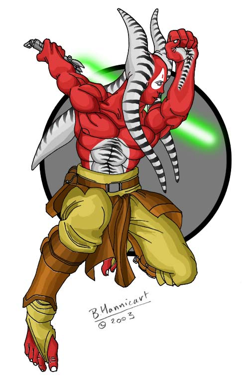 Derniers arrivés d’entre eux, Isak Tyrel et son nouvel apprenti : Chag, un Chagrian. Isak l’a rencontré sur Teero, une planète éloignée. Chag avait déjà son propre sabrelaser, hérité de son ocle, de ce que vous avez compris.