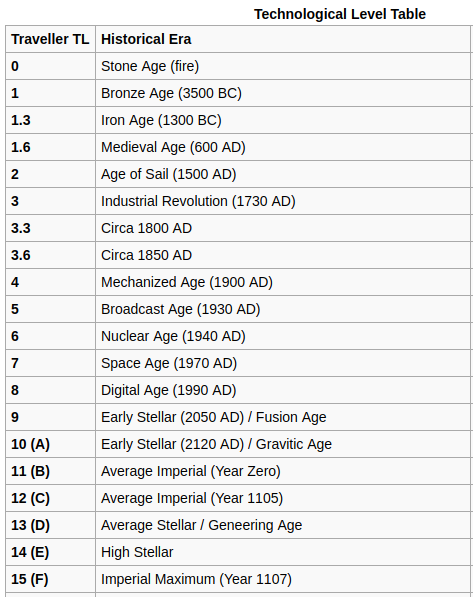* Les K'kree semblent avoir un TL moyen de 11 et les Hivers de 13, mais leur technologie est tellement différente de celle des humains que c'est difficile à évaluer.